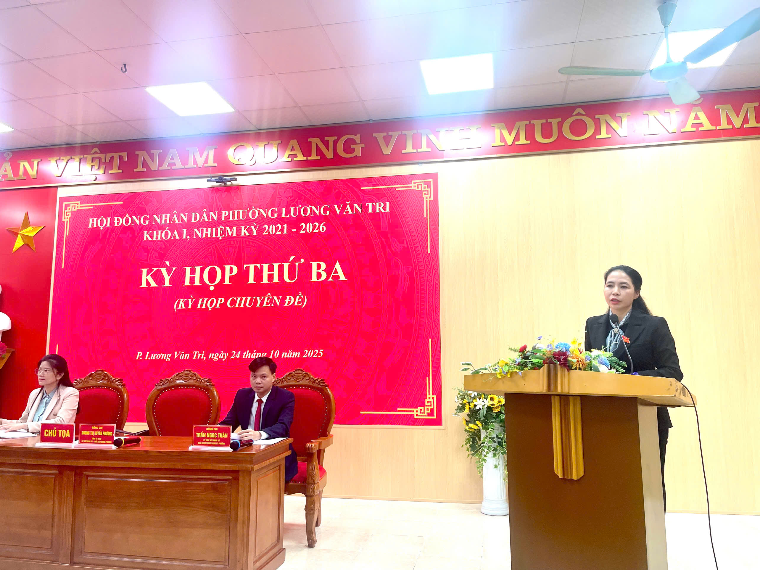 Sáng ngày 24/10/2025, Hội đồng nhân dân phường Lương Văn Tri, khóa I, nhiệm kỳ 2021-2026 đã tổ chức thành công kỳ họp thứ Ba (kỳ họp chuyên đề). Chủ tọa kỳ họp gồm đồng chí Dương Thị Huyền Phương, Tỉnh ủy viên, Bí thư Đảng ủy, Chủ tịch HĐND phường và 02 đồng chí: Trưởng Ban Kinh tế - Ngân sách và Trưởng Ban Văn hóa - Xã hội HĐND phường.