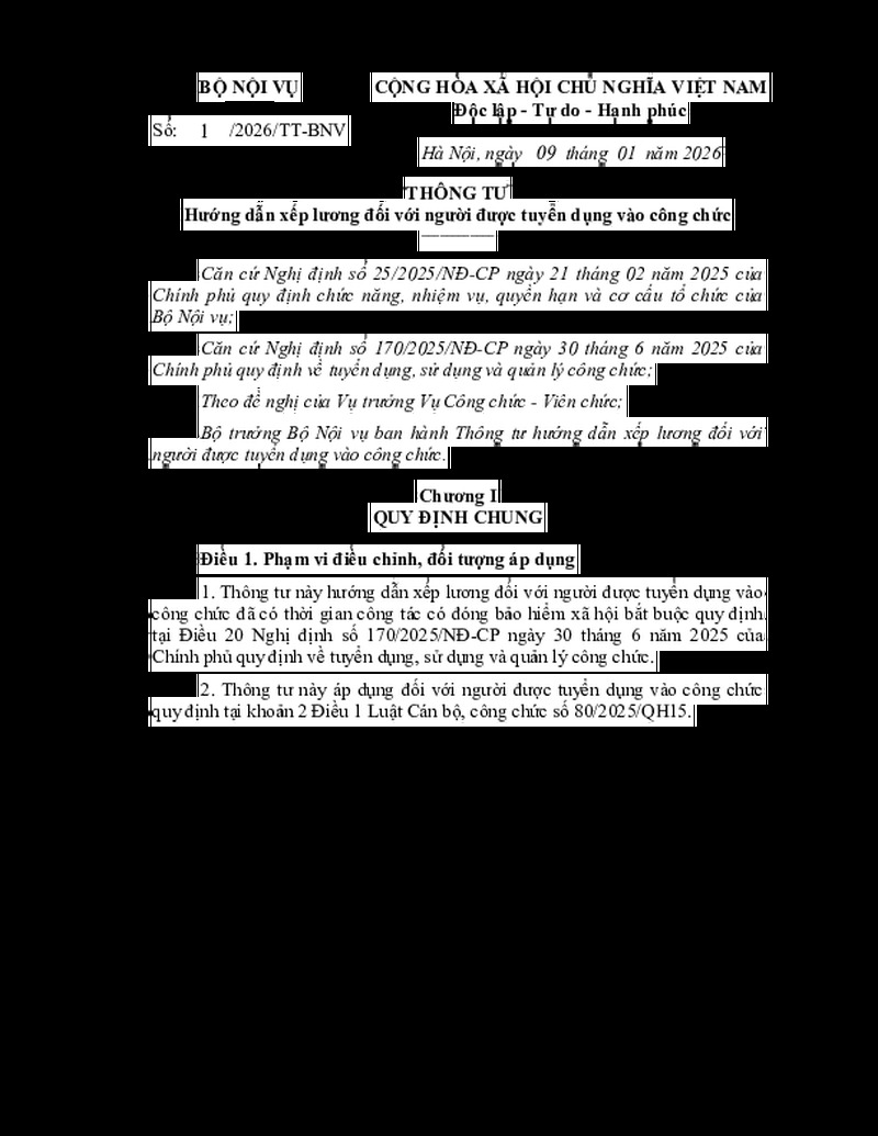 | Tiêu đề văn bản | Thông tư 01/2026/TT-BNV về Hướng dẫn xếp lương đối với người được tuyển dụng vào công chức | ||