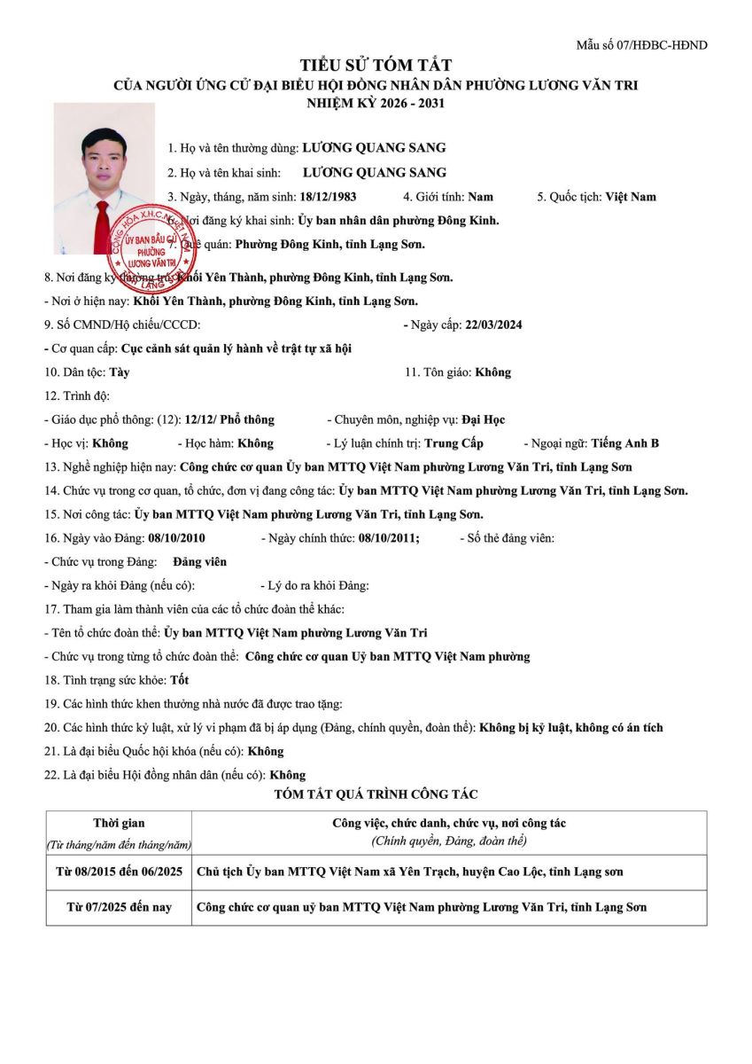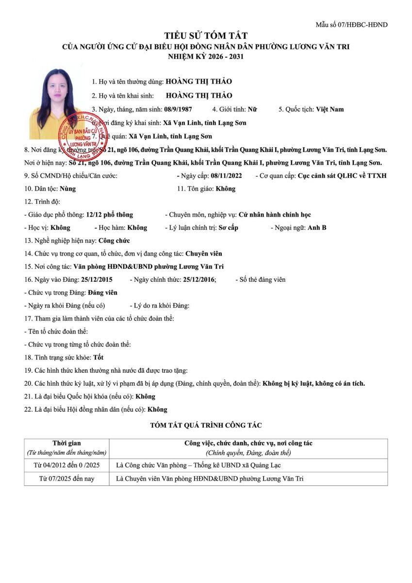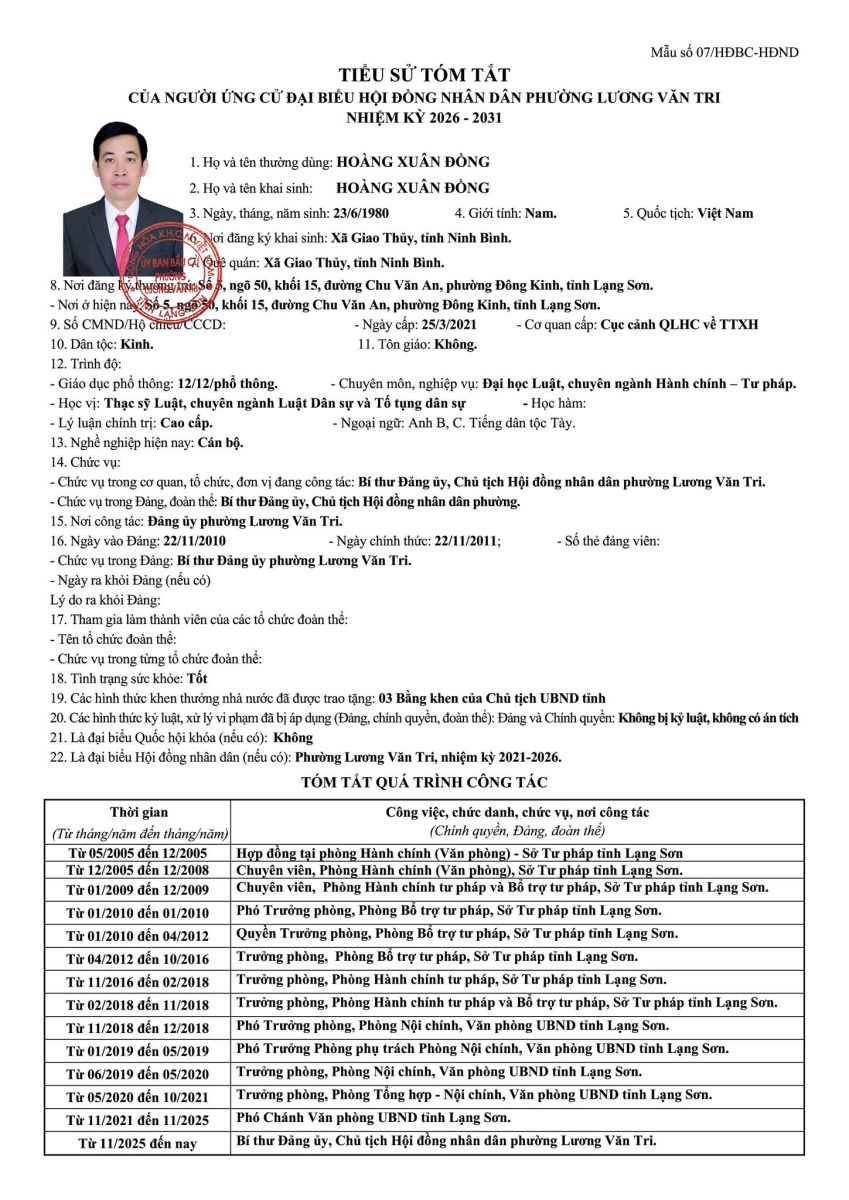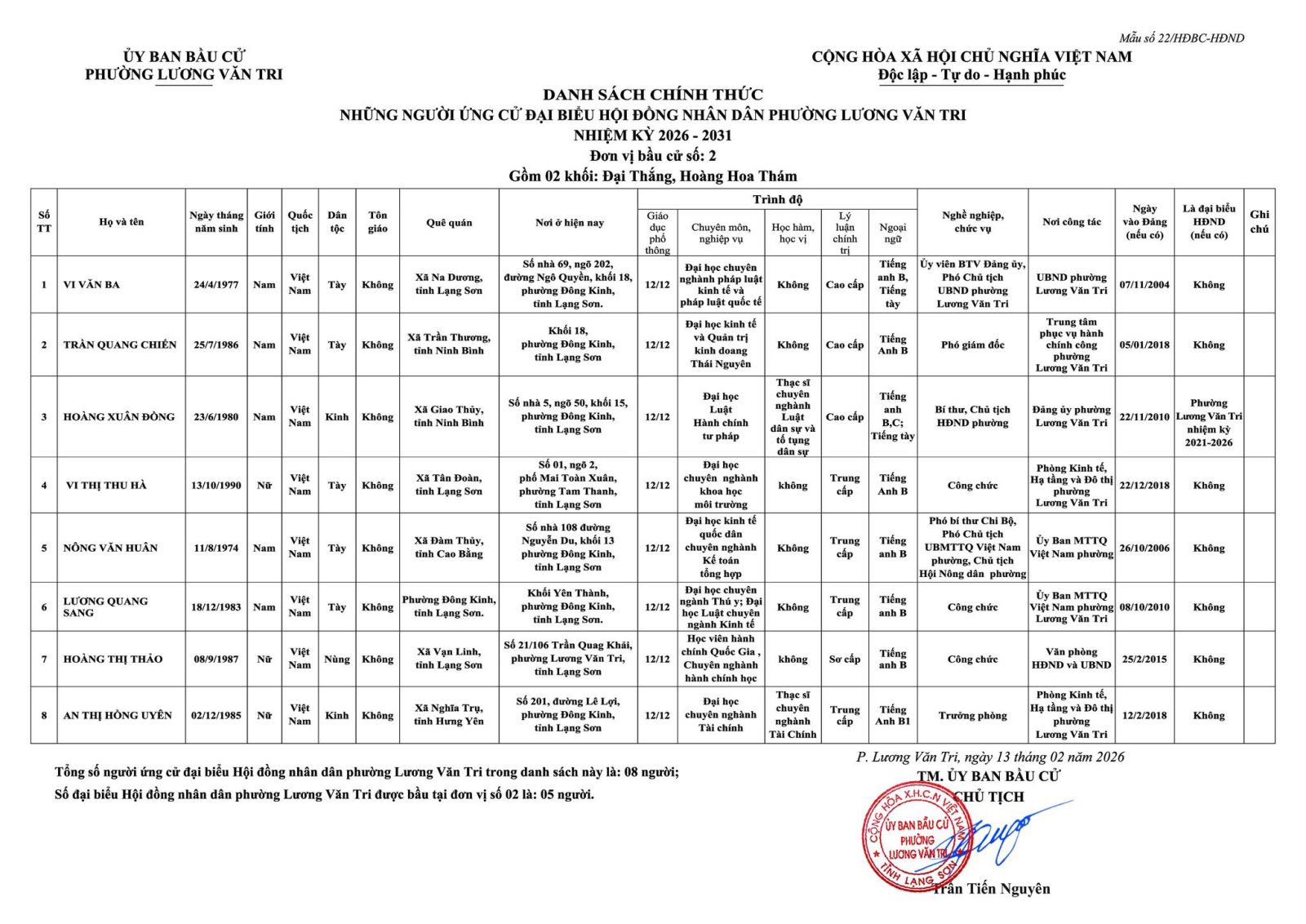 Danh sách và Tiểu sử tóm tắt của những người ứng cử Đại biểu HĐND phường Lương Văn Tri nhiệm kỳ 2026 - 2031 tại Đơn vị bầu cử số 2. Gồm 2 khối: Đại Thắng, Hoàng Hoa Thám.