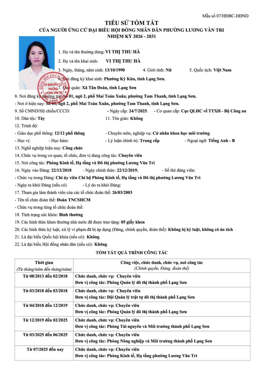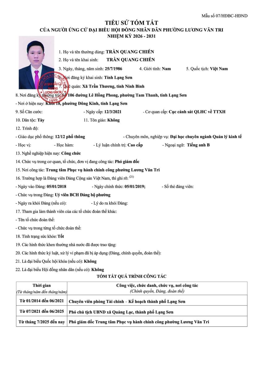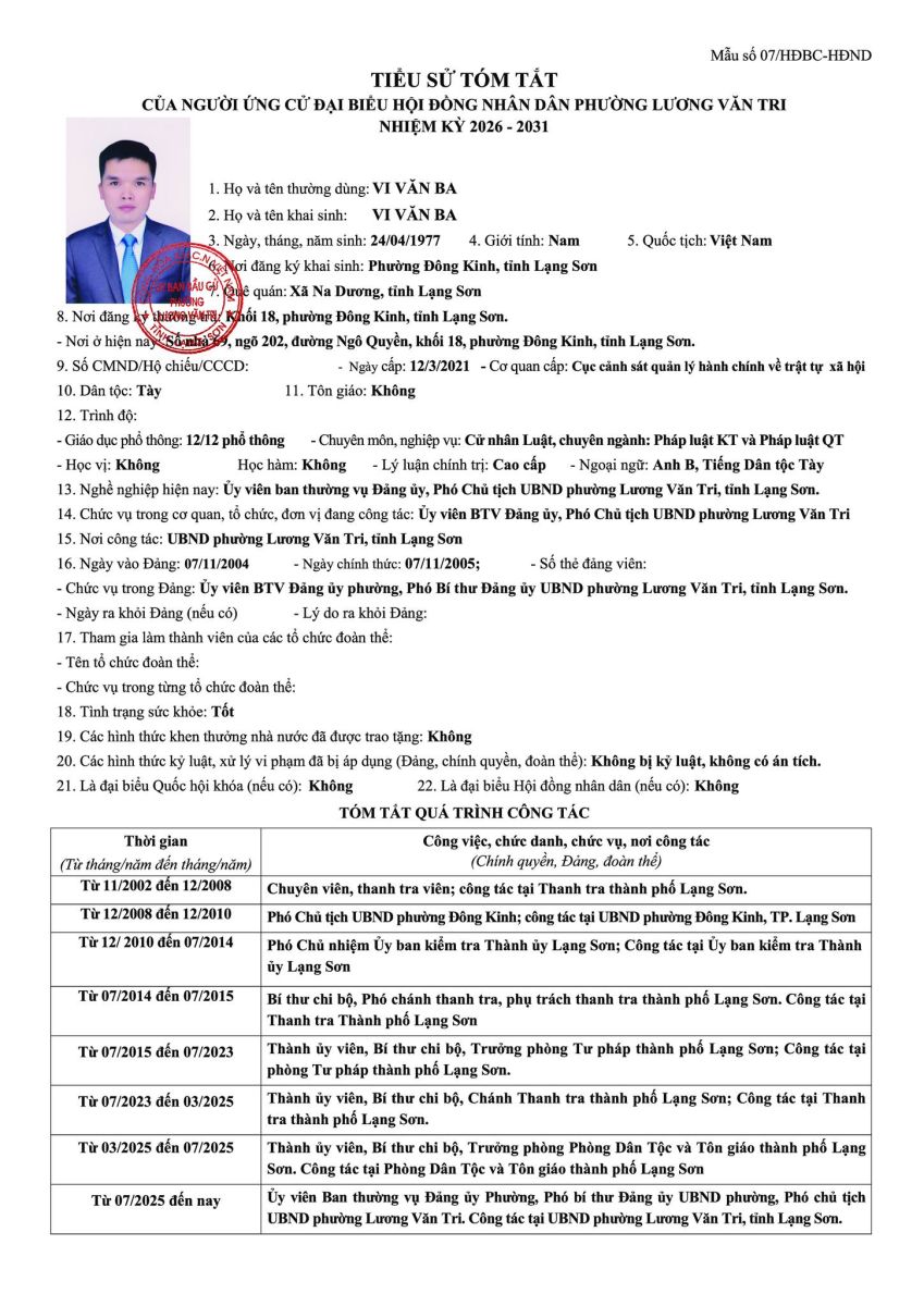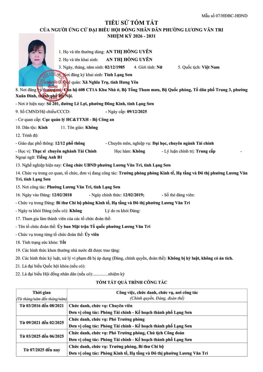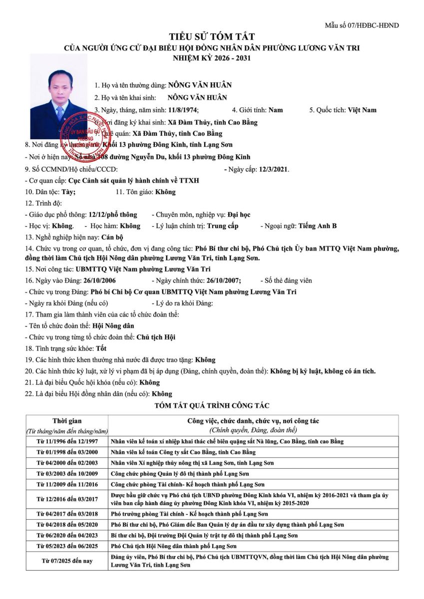 Danh sách và Tiểu sử tóm tắt của những người ứng cử Đại biểu HĐND phường Lương Văn Tri nhiệm kỳ 2026 - 2031 tại Đơn vị bầu cử số 2. Gồm 2 khối: Đại Thắng, Hoàng Hoa Thám.