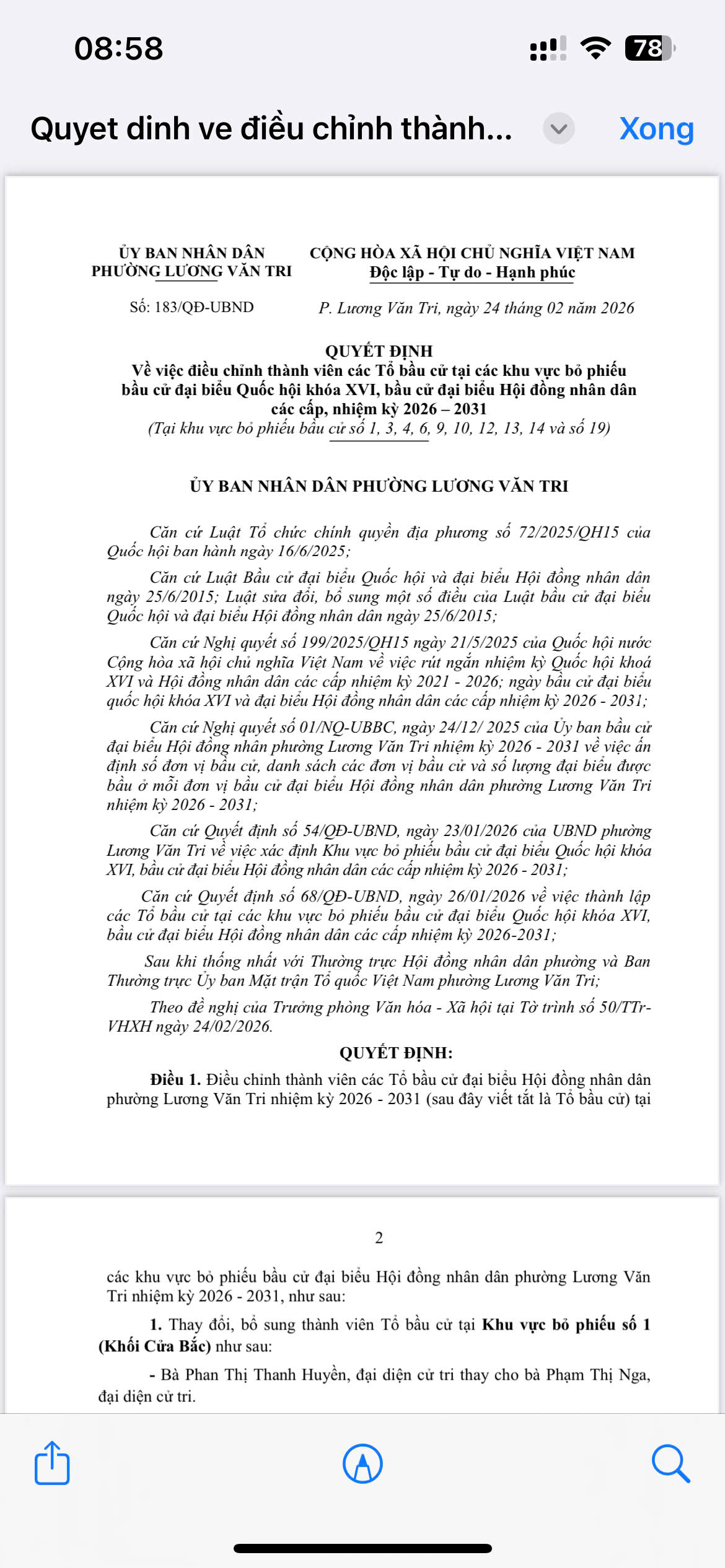 Về việc điều chỉnh thành viên các Tổ bầu cử tại các khu vực bỏ phiếu bầu cử đại biểu Quốc hội khóa XVI, bầu cử đại biểu Hội đồng nhân dân các cấp, nhiệm kỳ 2026 – 2031