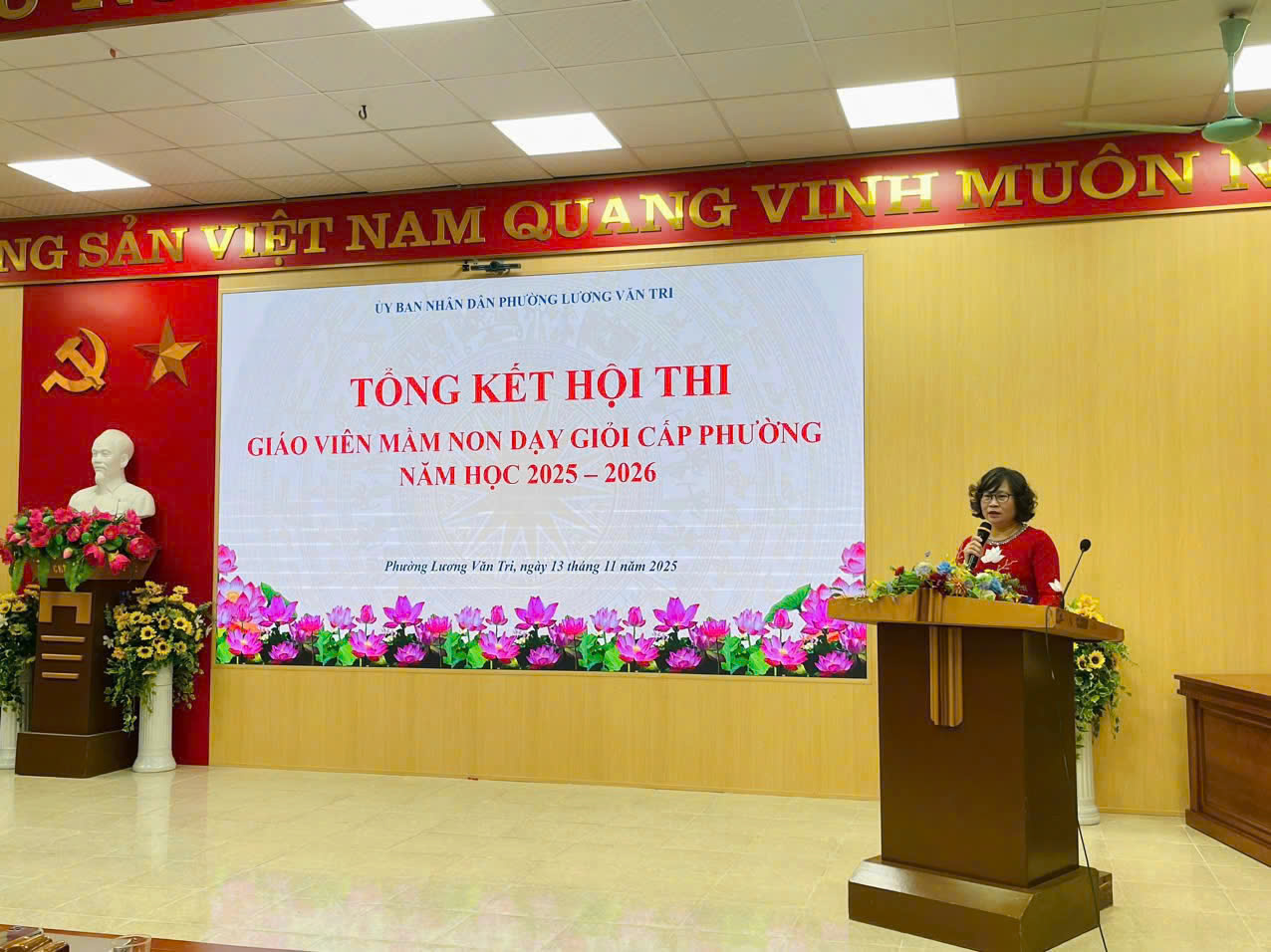 Chiều ngày 13/11/2025, UBND phường Lương Văn Tri tổ chức tổng kết Hội thi giáo viên mầm non dạy giỏi cấp phường năm học 2025 - 2026. Tham dự có đồng chí Nguyễn Lệ Thùy - Phó Chủ tịch UBND phường, Trưởng ban Tổ chức Hội thi; đồng chí Vũ Lê Dũng - Trưởng phòng Văn hóa - Xã hội phường cùng dự có đại diện lãnh đạo các trường học trên địa bàn, các thí sinh và giáo viên trong khối mầm non.