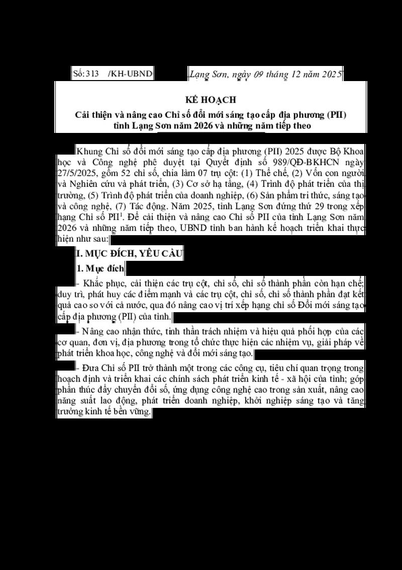 | Tiêu đề văn bản | Kế hoạch 313/KH-UBND tỉnh về Cải thiện và nâng cao Chỉ số đổi mới sáng tạo cấp địa phương (PII) tỉnh Lạng Sơn năm 2026 và những năm tiếp theo | ||