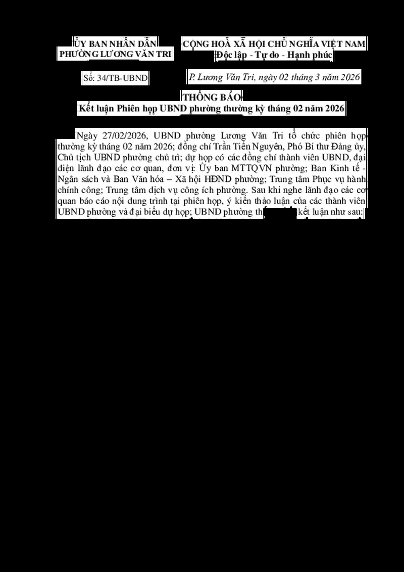 | Tiêu đề văn bản | Thông báo kết luận Phiên họp UBND phường thường kỳ tháng 02 năm 2026 | ||
